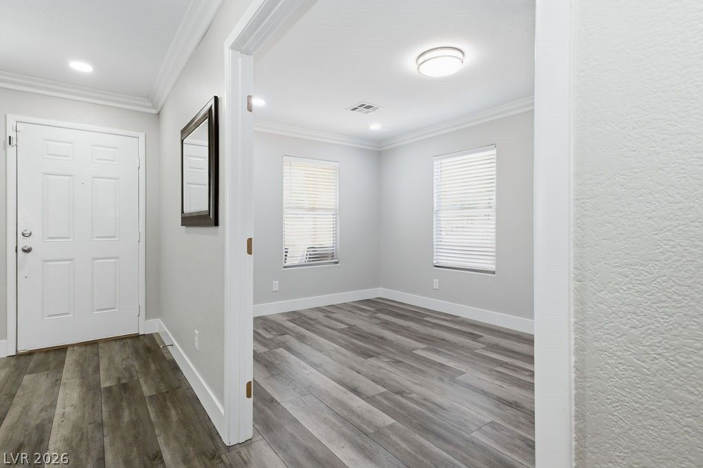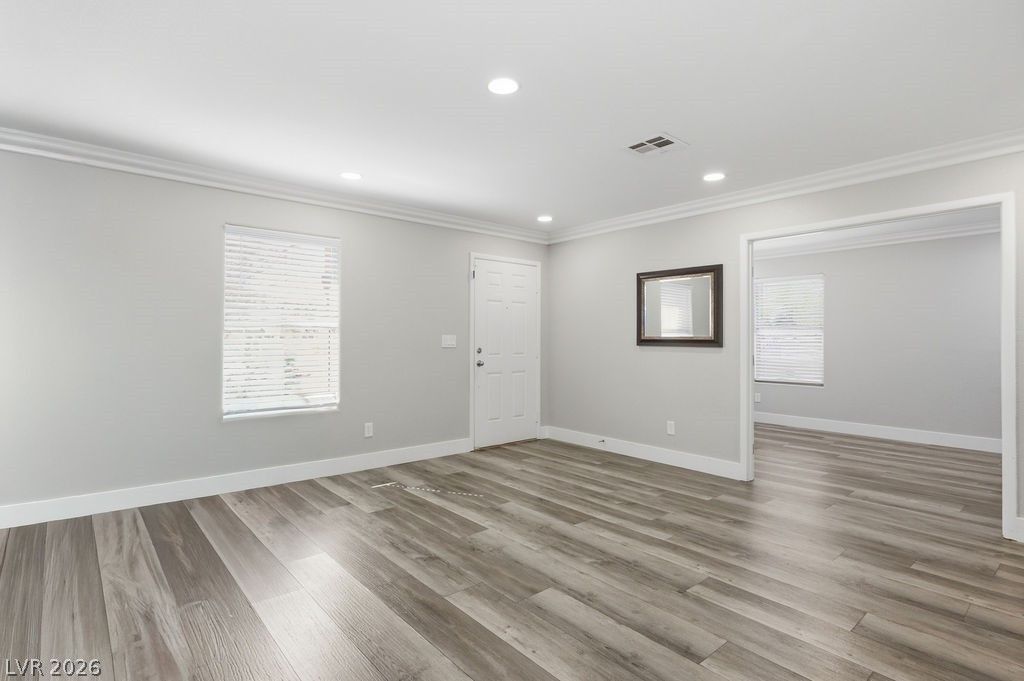 Stunning fully renovated single-story home offering 3 bedrooms, 2 bathrooms, plus a versatile den. Thoughtfully upgraded with brand-new luxury vinyl plank flooring, fresh designer paint, new baseboards, and elegant crown molding throughout. The reimagined kitchen features sleek granite countertops and stainless steel appliances, blending style with functionality. Retreat to the spacious primary suite, highlighted by a beautifully remodeled, spa-inspired shower. The open-concept layout and flexible den create the perfect balance of comfort and sophistication. Ideally located near parks, shopping, dining, and freeway access, this turnkey home delivers modern luxury in one of Henderson's most desirable areas.